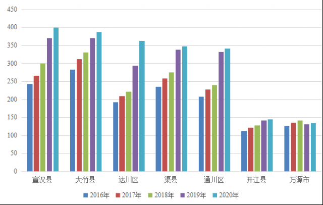 图1.2  2016年—2020年达州市各区县GDP变化情况